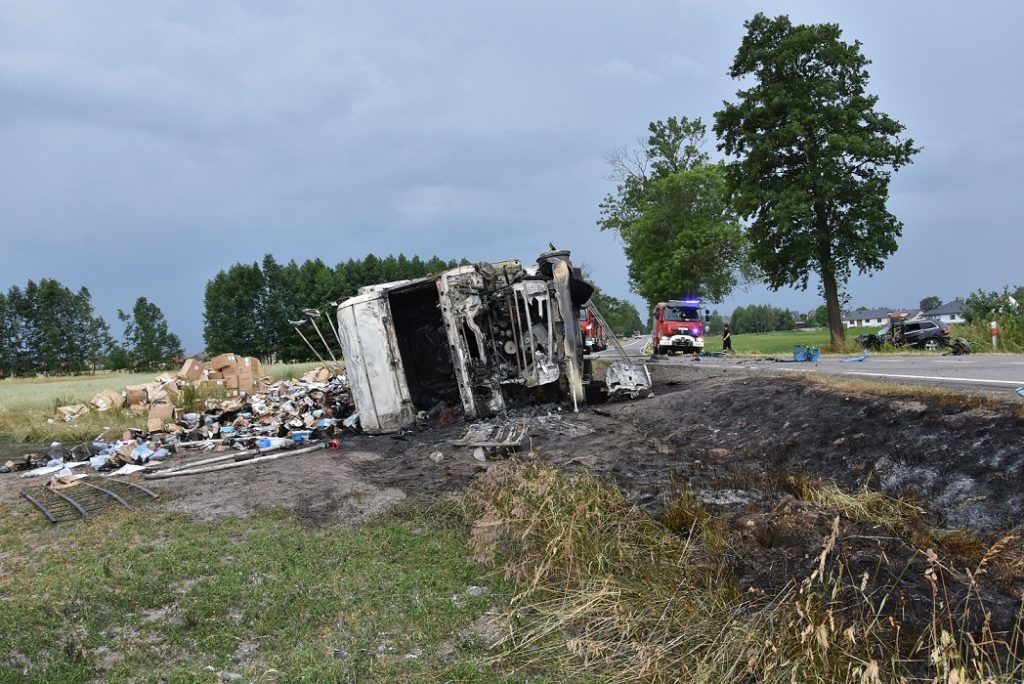 Do zdarzenia doszło w poniedziałek po godz.13.00 na drodze W-811 w miejscowości Hrud. Ze wstępnych ustaleń funkcjonariuszy wynika, że kierując samochodem osobowym marki Jeep 66-latek, z nieznanych przyczyn zjechał na przeciwległy pas ruchu, gdzie zderzył się ze Skanią. W wyniku uderzenia ciężarówka przewróciła się i zapaliła. Drugim autem kierował 24-latek.