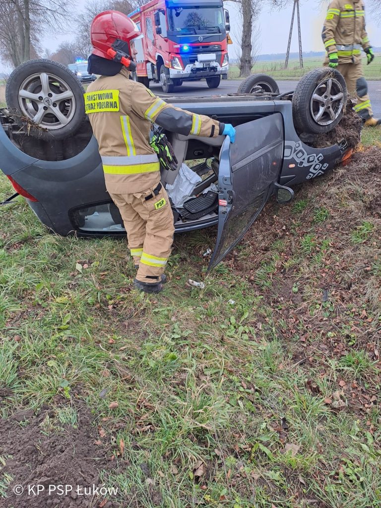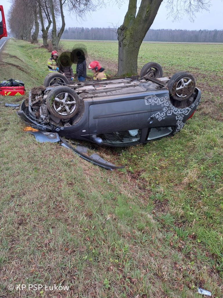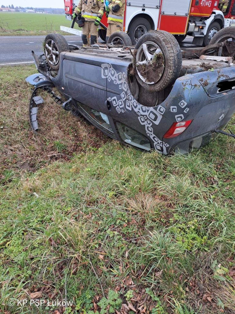 Dzisiaj (03.12) na drodze krajowej nr 63 po godzinie 10 na wysokości miejscowości Jeziory, gm. Łuków dachował samochód osobowy. Jedna osoba poszkodowana.