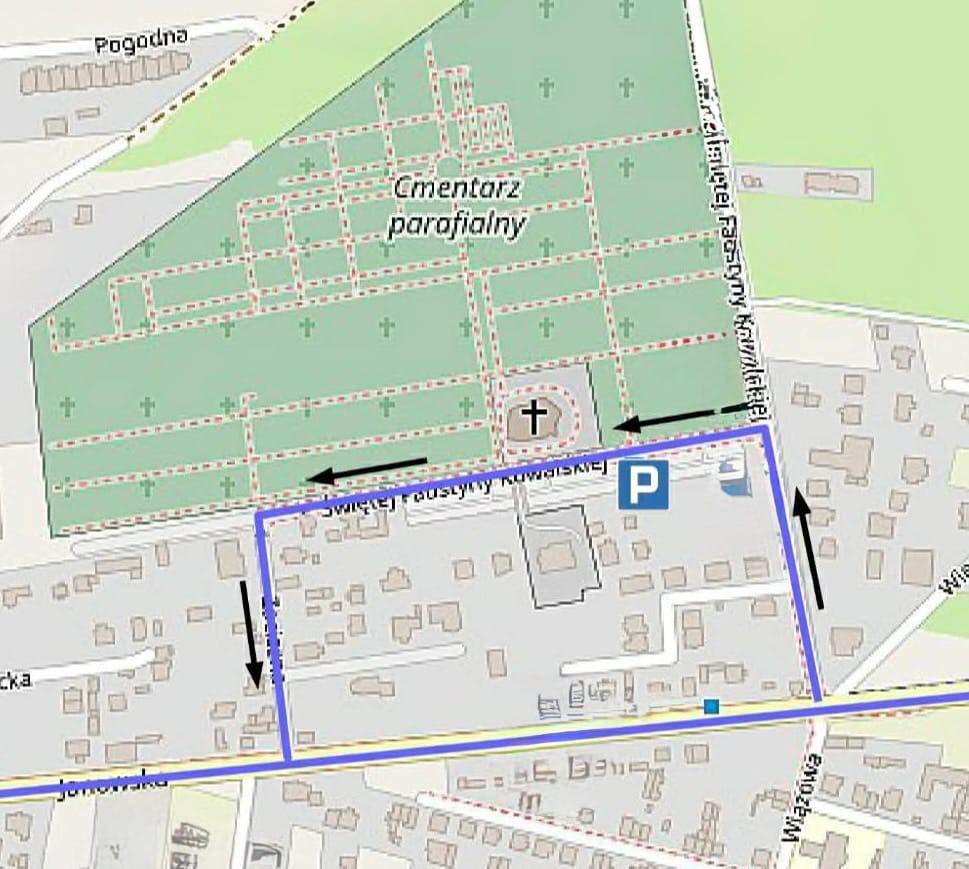 - drogi przyległe do cmentarza i kościoła będą funkcjonowały jako ulice jednokierunkowe (zgodnie z oznakowaniem i poleceniami policjantów),