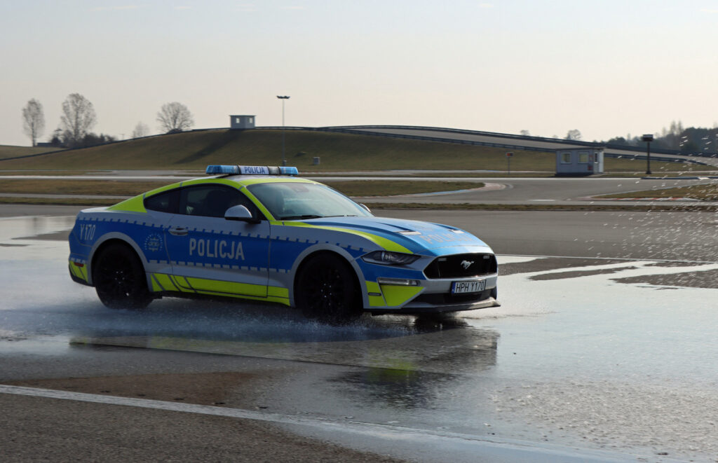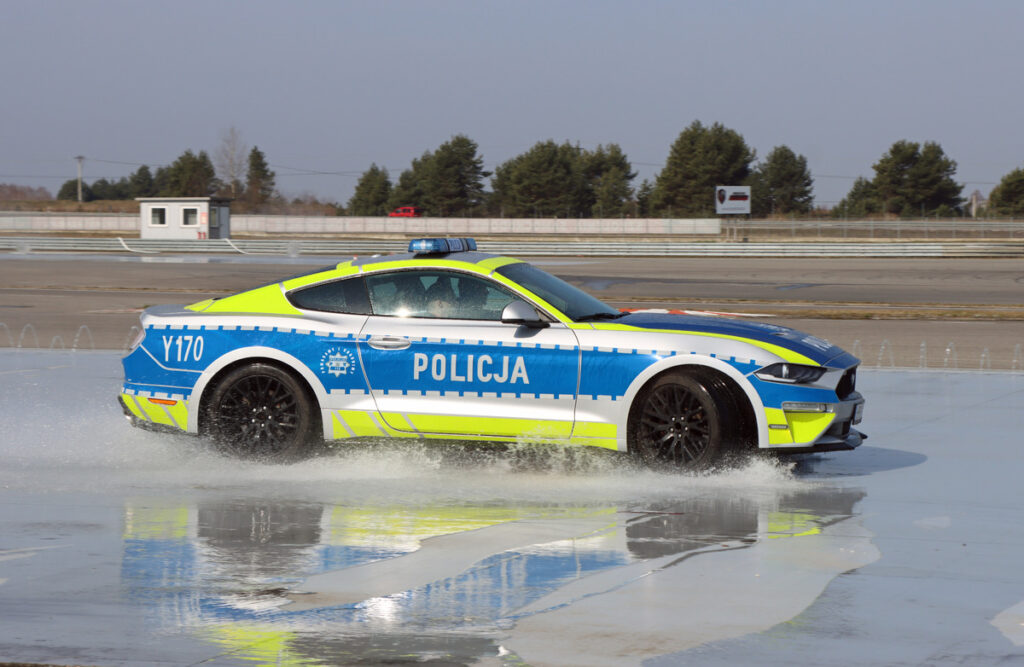 Doskonalą jazdę w ekstremalnych warunkach za kierownicą policyjnego Ford Mustanga