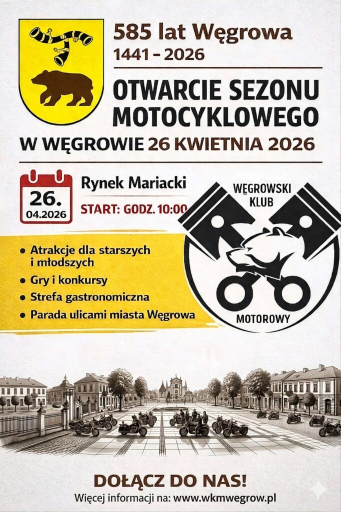 Już 26 kwietnia 2026 (niedziela) zapraszamy wszystkich miłośników dwóch kółek na wyjątkowy zlot z okazji otwarcia sezonu motocyklowego w Węgrowie.