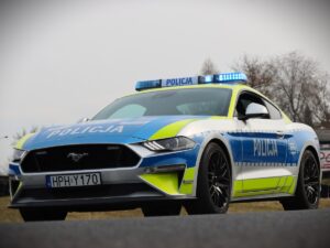 Doskonalą jazdę w ekstremalnych warunkach za kierownicą policyjnego Ford Mustanga